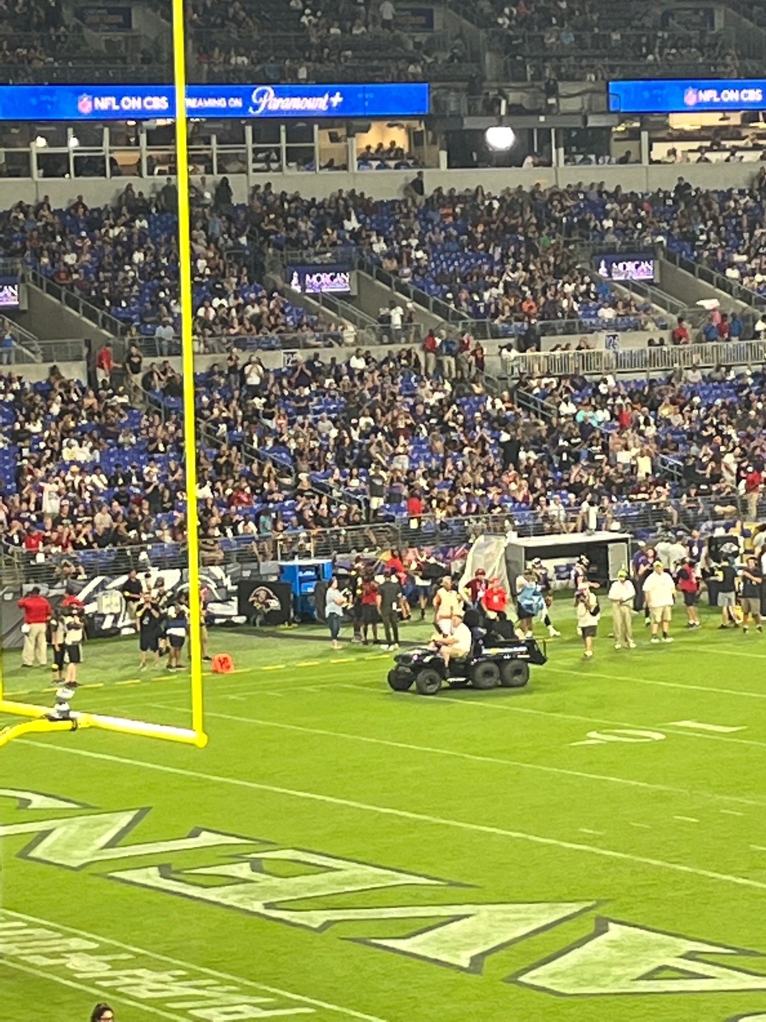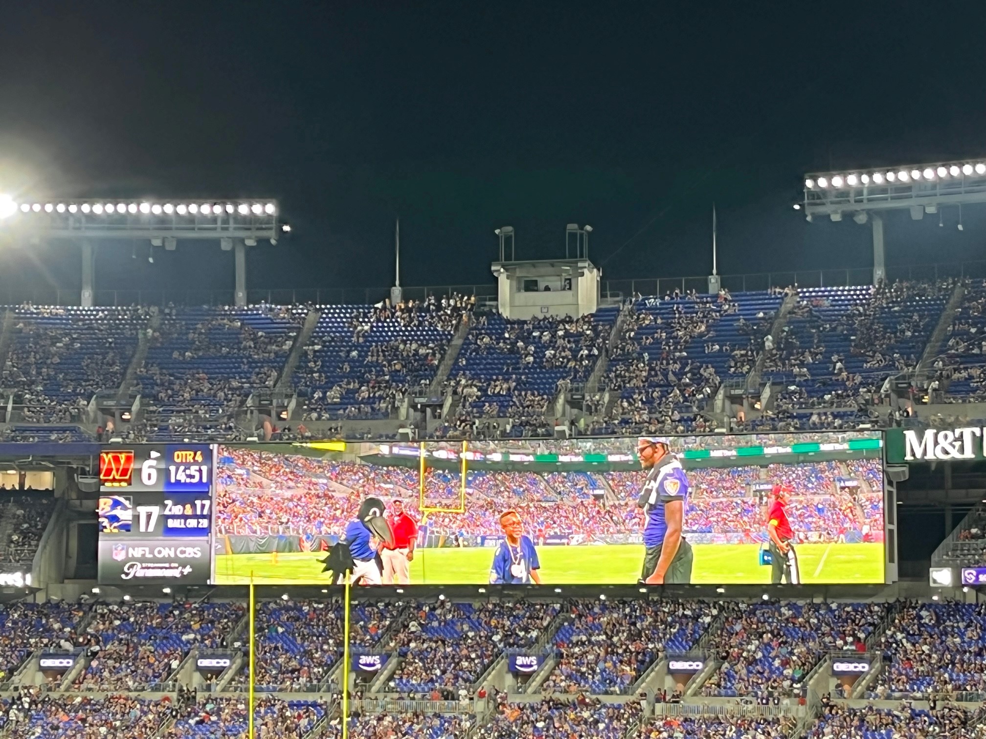 For anyone who has been to a game, there are always things going on during the game that you don’t see when you are at home on commercial. I think the funniest part of the game was at half time when all the various local mascots played against what I believe was a local junior team- these kids were small, so probably not high school. The Ravens mascot was injured on a play and they had to cart the bird off the field. In all my years of watching NFL football, I don’t think I have ever seen a mascot on the injury cart.